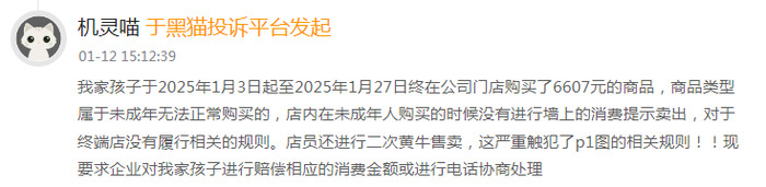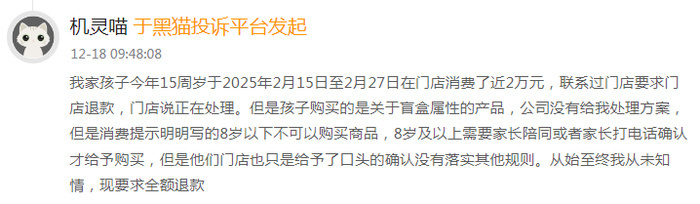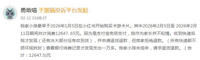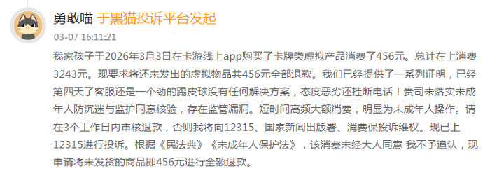 在黑猫投诉平台上,涉及卡游的投诉量有数千条,主要集中在诱导消费、未成年人退款难、霸王条款等问题上。