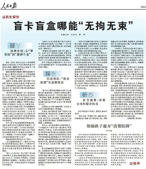 央视财经、《人民日报》等权威媒体曾多次点名批评卡游诱导未成年人非理性消费,甚至将其比作“变相赌博”。