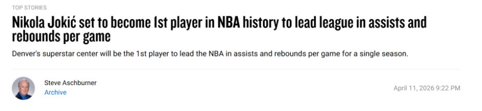 如今约基奇的史诗级数据表现,加上球队目前11连胜的势头,无疑会增加他争夺MVP的筹码,就像他帮助掘金在西部排位中一路攀升那样。但效果究竟有多大仍有待观察:上赛季他以中锋身份打出场均三双,最终在三位MVP得主中也只拿到选票第二。现在,雷霆的亚历山大依然是MVP头号热门,而且在媒体和球员摸底调查中,亚历山大都获得了最多的支持。